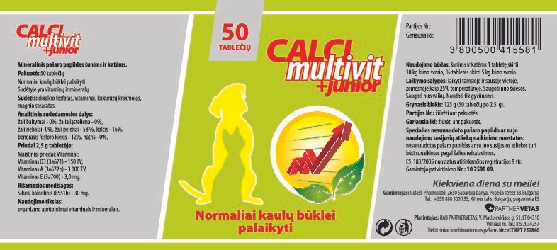 Calci Multivit + junior mineralinis pašaro papildas  skiriamas jauniems augintiniams, tenkinti kalcio ir fosforo fiziologinius poreikius. Kalcio, fosforo, vitaminų A, D3 ir E atitinkantis fiziologinis santykis skatina kaulų ir dantų vystymąsi bei jaunų šuniukų ir kačiukų augimą. Profilaktiškai veikia nuo osteomaliacijos ir palaiko raumenų ir nervų sistemos funkcijas.